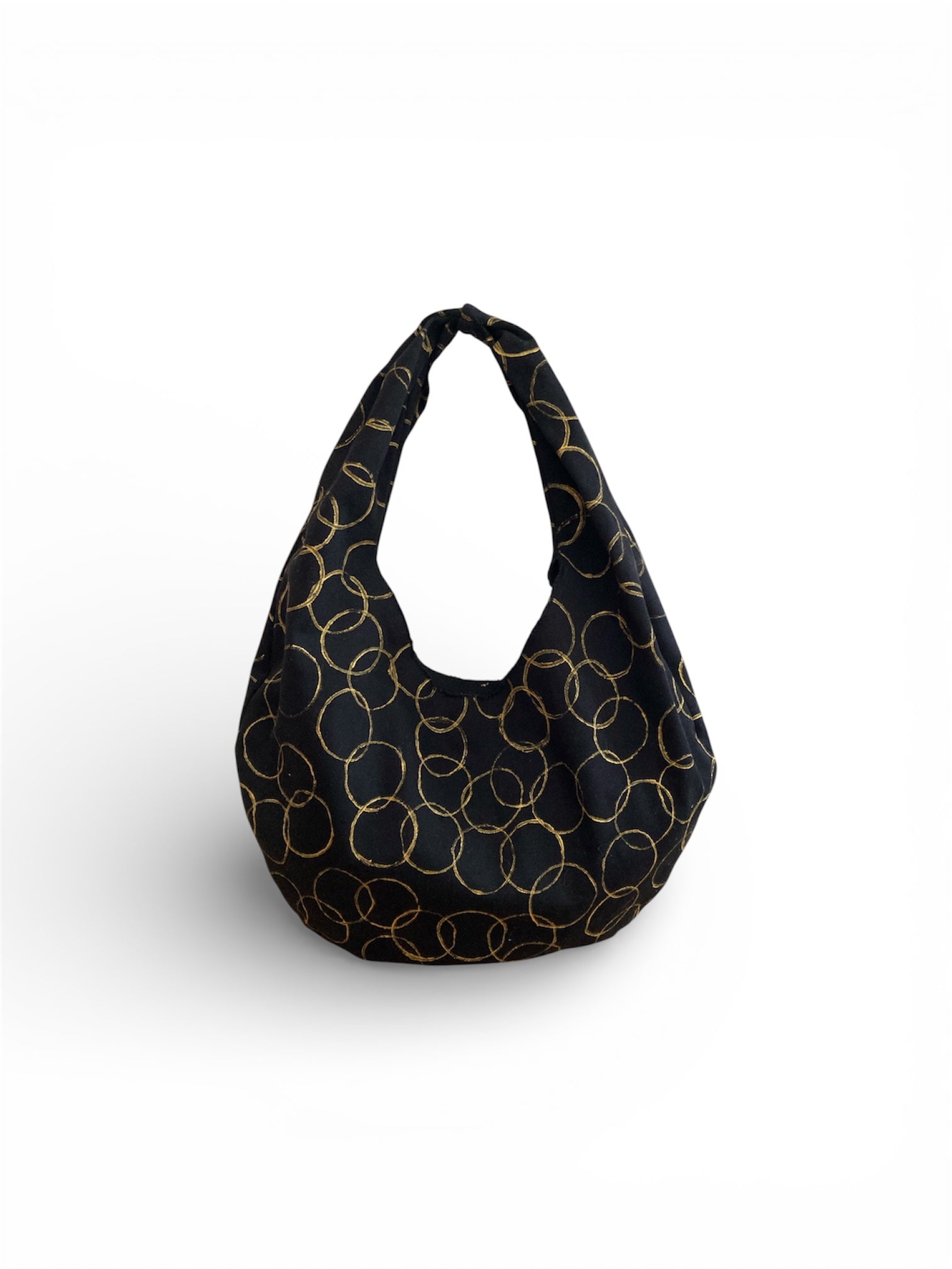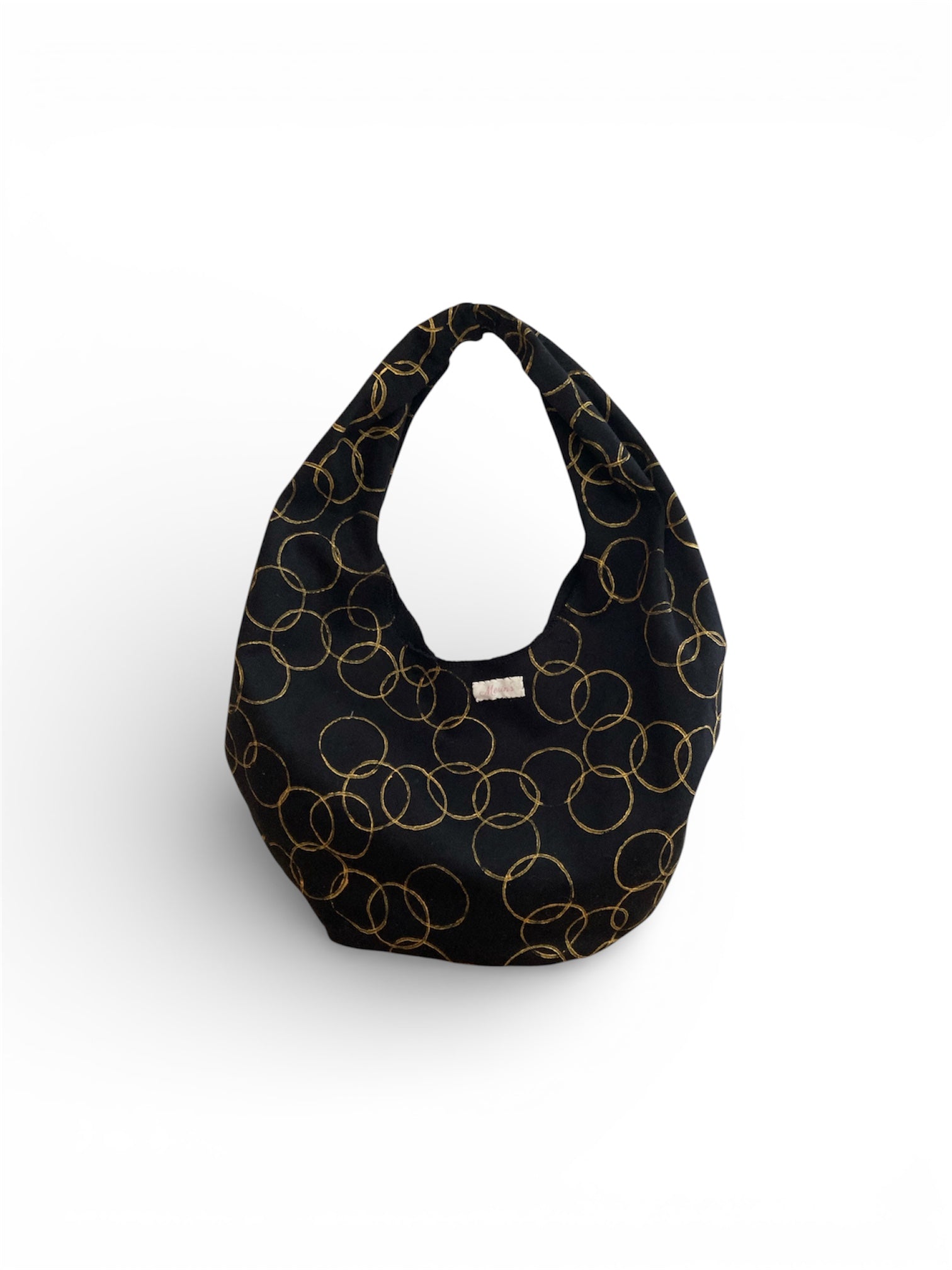 Bolso ovalado, de algodón. Estapado a mano circulos de color dorado.